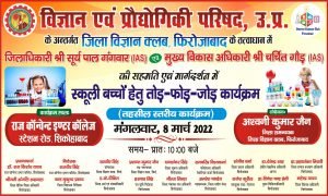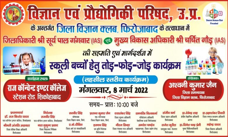 ( जिला फिरोजाबाद शिकोहाबाद के राज कॉन्वेंट इंटर कॉलेज में विज्ञान एवं प्रौद्योगिकी जिला विज्ञान क्लब के द्वारा स्कूली बच्चों द्वारा 8 मार्च को उपकरणों को तोड़फोड़ जोड़ कार्यक्रम का किया जाएगा आयोजन )