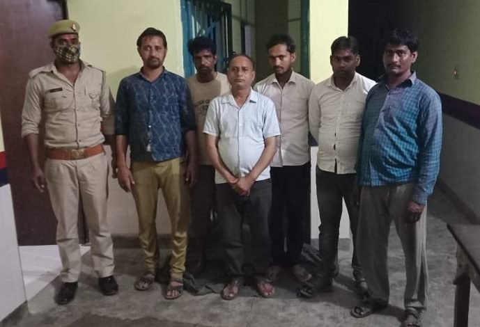 उत्तर प्रदेश औरैया थाना अछल्दा उ0नि0 श्री हरिकेश कुमार मय हमराह थाना अछल्दा द्वारा गश्त चेकिंग के दौरान अभियुक्तगण 1. अमित कुमार पुत्र गोविंद गुप्ता 2. आनंद बाबू पुत्र राधेश्याम गुप्ता 3. राजेश कुमार गुप्ता पुत्र रमन बाबू 4. राजू राजपूत पुत्र श्री रामशंकर 5. मनीष कुमार पुत्र आदेश शुक्ला निवासी गण ग्राम कस्बा नेविलगंज थाना अछल्दा जनपद औरैया 6. सुनील गुप्ता पुत्र सूरज प्रसाद निवासी सरायबाजार अछल्दा थाना अछल्दा जनपद औरैया को गिरफ्तार किया गया जिनके कब्जे से कुल 34920 रु0 व 52 अदद तास के पत्ते बरामद कर मु0अ0स0 80/22 धारा 13 जुआ अधिनियम पंजीकृत कर विधिक कार्यवाही की गयी।