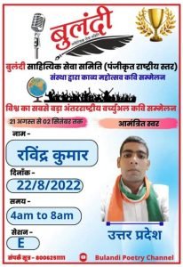 उत्तर प्रदेश औरैया अछल्दा ग्राम पंचायत लहटोरिया अछल्दा जनपद औरैया के निवासी लौहपुरुष से सम्मानित रविन्द्र कुमार पुत्र श्री संतराम दोहरे का चयन बुलंदी साहित्यिक सेवा समिति (पंजीकृत राष्ट्रीय स्तर) के द्वारा आयोजित कार्यक्रम *विश्व का सबसे बड़ा अंतर्राष्ट्रीय कवि सम्मलेन के लिए हुआ बुलंदी संस्था आगामी 21 अगस्त 2022 से 2 सितम्बर 2022 तक विश्व का सबसे बड़ा कवि सम्मलेन आयोजित करने जा रही है, जिसकी सम्पूर्ण तैयारी भी कर ली गयी है. इस वर्चुअल कार्यक्रम में भारत सहित नेपाल, कनाडा, अमेरिका, ऑस्ट्रेलिया, जर्मनी, रूस, न्यूजीलेंड, सिंगापुर, मरिसस, दुबई, सऊदी अरब, ओमान, म्यांमार के सहित ही विश्व के 35 देशों के हिंदी भाषीय साहित्यकार सम्मिलित होंगे यह कार्यक्रम 300 घंटो तक अनवरत चलेगा, इस अंतर्राष्ट्रीय कवि सम्मलेन का सीधा प्रसारण हिंदुस्तान में बुलंदी के यूट्यूब चैंनल के साथ साथ हिंदी टाइम्स मिडिया कनाडा द्वारा अमेरिका, कनाडा, न्यूजीलेंड, एवं ऑस्ट्रेलिया के स्थानीय चैनलों पर लाइव प्रसारण किया जायेगा यह कवि सम्मलेन इंडिया विश्व रिकॉर्ड दर्ज किया जायेगा. बताते चले कि विगत वर्ष भी बुलंदी संस्था ने 207 घंटे का विश्व रिकॉर्ड बनाया था इस वर्ष संस्था अपना ही रिकार्ड तोड़ रही है. संस्था द्वारा रविन्द्र कुमार को संस्था के संस्थापक विवेक बादल बाजपुरी एवं संरक्षक पंकज शर्मा द्वारा लिखित निमंत्रण / आमंत्रित पत्र प्राप्त हुआ है संस्था द्वारा बताया गया कि विश्व से करीब 1275 कलमकार इस कार्यक्रम में प्रतिभाग कर रहे है कार्यक्रम प्रसारण के लिए दिल्ली प्रयागराज और रूद्र प्रयाग नगर टेक्निकल हेड ऑफिस बनाये गए है और संस्था द्वारा बताया गया की 22 अगस्त 2022 को सुबह 04 बजे से 08 बजे के मध्य रविन्द्र कुमार औरैया उत्तर प्रदेश एवं भारत की संस्कृति और भाषा व साहित्य को विश्व पटल के मंच पर रखेंगे इस कामयाबी के लिए रविन्द्र कुमार अपने माता पिता, गुरुजनों, और प्रेरणादायी शुभचिंतक मित्रों को श्रेय देना चाहते है और वह कहते है कि आप आशीम आशीर्वाद और स्नेह से ही यह सब संभव हो पा रहा है | आपको बता दें रविन्द्र कुमार इस कार्यक्रम में नवी मुम्बई से शामिल होकर वेश्विक स्तर पर अपनी जनपद औरैया एवं पुरे उत्तर प्रदेश एवं हिंदुस्तान का नाम रोशन करेंगे रविन्द्र कुमार कुमार का जन्म बहुत ही गरीब परिवार में हुआ पिता श्री संतराम जी आज भी पेशे से मजदूर है और रविंद्र कुमार भारतीय नौसेना गोड़ीवाड़ा में असैनिक पद पर कार्यरत है और अपनी हिंदी साहित्य में भी रूचि रखते है और यही नही सामाजिक कार्यों के लिए आयरन मैन ऑफ इंडिया ( भारत का लौहपुरुष) से भी 2021 में इन्हे नवाजा जा चुका है अब तक विशाखापट्नम आकाशवाणी केंद्र व कई उच्च स्तरीय कवि सम्मलेन में प्रतिभ