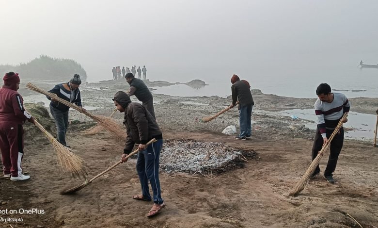 ( औरैया यमुना तट पर एक विचित्र पहल सेवा समिति द्वारा शरद ऋतु के घने कोहरे में श्मशान घाट पर चला स्वच्छता अभियान )