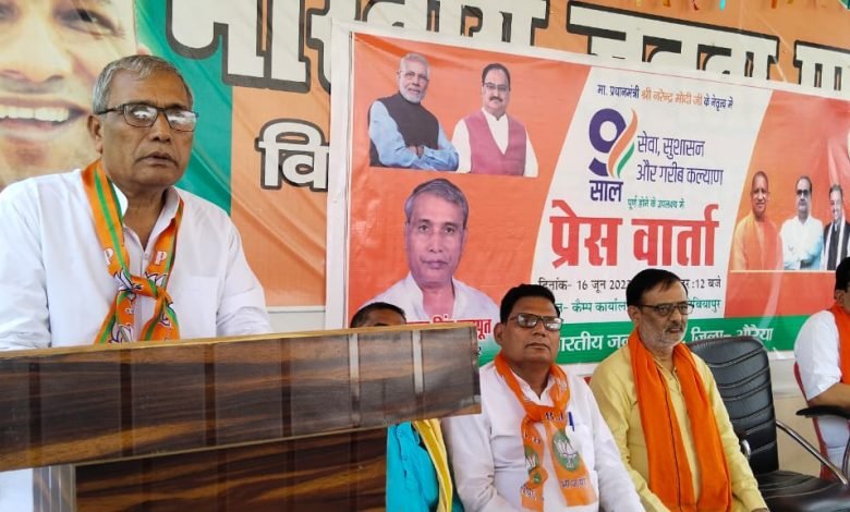 उत्तर प्रदेश औरैया दिबियापुर रोड पर स्थित पूर्व कृषि राज्यमंत्री के कैंप कार्यालय पर भाजपा की केंद्र सरकार के 9 साल की उपलब्धियां को लेकर दिबियापुर विधानसभा के पूर्व भाजपा विधायक एवं पूर्व कृषि राज्यमंत्री लाखन सिंह राजपूत ने भाजपा जिला उपाध्यक्ष प्रेम गुप्ता, भाजपा शिक्षक प्रकोष्ठ जिला संयोजक राजेश कुमार अग्निहोत्री, समाजसेवी कमलेश अवस्थी, अवधेश सिंह पिंकी, अमर सिंह राजपूत, जितेंद्र सिंह राजावत, परवेश राणा, अर्पित सिंह चौहान, प्रमोद राजपूत, विकास राजपूत आदि की उपस्थिति में प्रेसवार्ता की जिसमे पूर्व भाजपा विधायक एवं पूर्व कृषि राज्यमंत्री लाखन सिंह राजपूत ने बताया कि प्रधानमंत्री नरेंद्र मोदी के नेतृत्व में भारत विकास की तरफ बढ़ रहा है। 80 के दशक से आज तक देश के विकास में भाजपा का योगदान बताया। 2004 से 2014 तक देश ने कमजोर नेतृत्व का दंश झेला। इन 10 सालो में भारत को कमजोर अर्थव्यवस्था कहा जाने लगा था। 130 करोड़ की आबादी ने 2014 में मोदी पर भरोसा किया। और आज देश का नेतृत्व मजबूत हाथों में है। उन्होंने कहा कि भारत ने वह दिन भी देखे जब पोलियो इत्यादि वैक्सीन भारत मे आने में वर्षों लगे थे। आज दो स्वदेशी कोविड टीके देश ने निर्मित किये और निर्यात भी किये। आत्मनिर्भर की दिशा में देश में चमत्कृत करने का काम हुए। 1121 लाख मीट्रिक टन अनाज बांटा जा रहा है। पूर्व कृषि राज्यमंत्री ने कहा कि 2करोड़ 65 लाख किसान डायरेक्ट बेनिफिट से किसान बीमा ले रहे है। किसानों की आमदनी दोगुना करने के लिए प्रयास हो रहे है। आर्थिक रूप से वंचित का आरक्षण 124 वा संविधान संशोधन करके ये काम किया गया। मोदी सरकार ने पिछड़ा वर्ग आयोग को संवैधानिक दर्जा दिलाने सहित