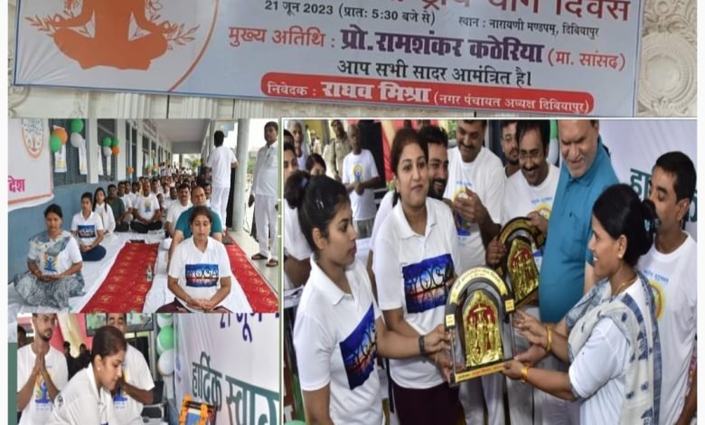 उत्तर प्रदेश औरैया के तिलक स्टेडियम में आयुष विभाग द्वारा नवम अंतरराष्ट्रीय योग दिवस समारोह का आयोजन हुआ। कार्यक्रम में मुख्य अतिथि सदर विधायक गुड़िया कठेरिया, विशिष्ट अतिथि भारतीय जनता पार्टी के जिला अध्यक्ष श्रीराम मिश्रा उपस्थित रहे। कार्यक्रम की शुरुआत मुख्य अतिथि सदर विधायिका गुड़िया कठेरिया, जिलाधिकारी नेहा प्रकाश, मुख्य विकास अधिकारी अनिल कुमार सिंह व पुलिस कप्तान चारू निगम ने दीप प्रज्वलन कर की। इस अवसर पर विधायिका गुड़िया कठेरिया ने सभी लोगों का स्वागत करते हुए योग का महत्व बताया और कहा कि यदि स्वस्थ रहना है तो योग करना आवश्यक है। उन्होंने कहा कि जब समाज स्वस्थ होगा तभी देश मजबूत होगा, मजबूत सामाज एक मजबूत राष्ट्र का निर्माण कर सकता है।उन्होंने देश के प्रधानमंत्री नरेंद्र मोदी जी की प्रशंसा करते हुए बताया कि उनके द्वारा आज से 9 वर्ष पूर्व यूएन में इसे अंतरराष्ट्रीय योग दिवस का दर्जा दिलवाया गया। इस अवसर पर भाजपा जिलाध्यक्ष श्रीराम मिश्रा ने उपस्थित लोगों को संबोधित करते हुए बताया कि योग हमारी प्राचीन सभ्यता और संस्कृति का हिस्सा है। उन्होंने बताया कि आदिकाल से ऋषि मुनियों ने योग के महत्व को बताने का प्रयास किया था। जब हम इस परंपरा से हटने लगे तो शरीर बीमार पड़ने लगा। उन्होंने कहा कि देश को अग्रणी रखना है समाज को स्वस्थ रखना है तो प्राचीन परंपरा योग की तरफ जाना पड़ेगा।इस अवसर पर जिलाधिकारी नेहा प्रकाश ने उपस्थित सभी लोगों का धन्यवाद अर्पित करते हुए कहा कि योग मूल संस्कृति है, खोज है। शरीर को मानसिक और शारीरिक रूप से स्वस्थ रखना है तो योग आवश्यक है।उन्होंने कहा कि पूरे जिले में योग दिवस का आयोजन किया जा रहा है। योग की महत्ता बताते हुए उन्होंने कहा कि करे योग रहे निरोग। स्वस्थ शरीर में स्वस्थ आत्मा का निवास होता है। पुलिस अधीक्षक चारू निगम ने कहा कि स्वस्थ रहें, सुखी रहें और स्वस्थ रहने के लिए योग काफी महत्वपूर्ण है। अंत में जिलाधिकारी ने जनप्रतिनिधियों को मोमेंटो प्रदान किया तथा मुख्य विकास अधिकारी द्वारा सभी उपस्थित गणमान्य का धन्यवाद व आभार प्रकट करते हुए कार्यक्रम के समापन की घोषणा की गई। कार्यक्रम का संचालन आयुर्वेदिक चिकित्सा अधिकारी डॉ रवि गुप्ता ने किया तथा योग प्रशिक्षक शशि राज सेठ, उत्कर्ष यादव व योगेंद्र मिश्रा उपस्थित रहे।