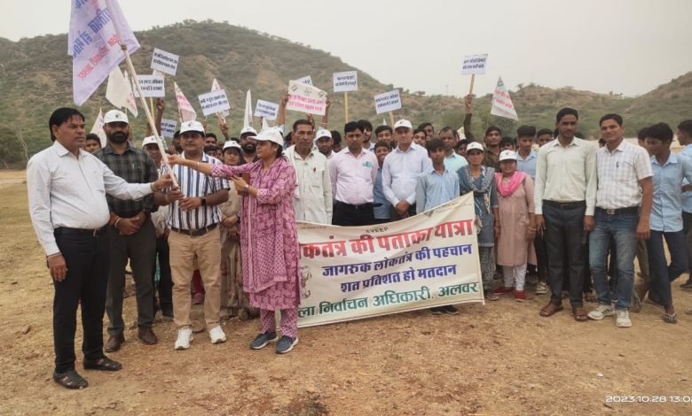 राजस्थान अलवर जिले के राजगढ़ में लोकतंत्र की पताका यात्रा को कस्बे के एसडीएम कार्यालय के सामने से रिटर्निग अधिकारी ओमप्रकाश मीना व तहसीलदार जुगीता मीना ने झंडी दिखाकर रवाना किया। रैली में सैकड़ो स्कूली छात्रों व कार्मिको ने भाग लिया। पताका यात्रा कस्बे के प्रमुख मार्ग गोल सर्किल, चौपड़ बाजार व माचाडी तक होते हुए प्रताप स्टेडियम में सम्पन्न हुई। इस दौरान स्कूली छात्र हाथो में तख्तियां लेकर चल रहे थे व मतदाताओ को यात्रा के माध्यम से मतदान के लिए जागरूक किया। रिटर्निग अधिकारी ओमप्रकाश मीना ने बताया कि 25 नवम्बर को आगामी विधानसभा चुनाव के मतदान दिवस नियत है। जिस पर शत-प्रतिशत मतदान के लिए मतदाताओ में जागरूकता फैलाने के लिए एक लोकतंत्र की पताका रैली का आयोजन जिला निर्वाचन अधिकारी के निर्देश में किया जा रहा है। जिससे पूरे विधानसभा क्षेत्र के वोटरो को जागरूक जाएगा की कोई भी मतदाता मतदान से नही छूटे और इस मजबूत लोकतंत्र में अपनी भागीदारी सुनिश्चित करते हुए अपने मताधिकार का प्रयोग करे। रिटर्निग अधिकारी ओमप्रकाश मीना ने बताया कि यात्रा अलवर ग्रामीण से राजगढ़ तहसीलदार जुगीता मीना ने रिसीव किया। इसके बाद पताका यात्रा को राजगढ़ एसडीएम कार्यालय से झंडी दिखाकर प्रताप स्टेडियम में जाकर सम्पन्न हुई। जहां पताका यात्रा की झंडी को रैणी तहसीलदार को सौंपा। फिर वे माचाडी, रैणी, पिनान में निकालेंगे। इस मौके पर कार्मिक व स्कूली विधार्थी मौजूद रहे।