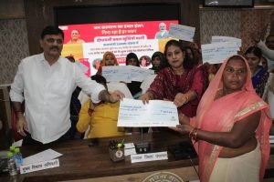 ( जिलाधिकारी व जिला पंचायत अध्यक्ष द्वारा उज्ज्वला योजना के तहत लाभार्थियों को रसोई गैस रिफिल के चेक द्वारा धनराशि किया गया वितरण )