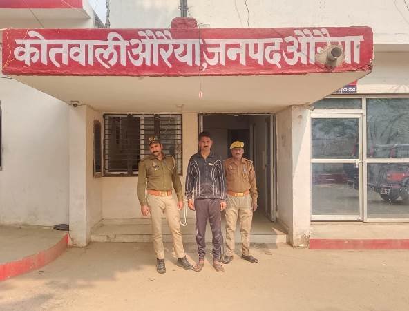 उत्तर प्रदेश औरैया पुलिस अधीक्षक औरैया श्रीमती चारू निगम व अपर पुलिस अधीक्षक औरैया श्री दिगम्बर कुशवाहा के कुशल निर्देशन में अपराध एवं अपराधियों के विरूद्ध चलाये जा रहे अभियान के क्रम में व क्षेत्राधिकारी सदर श्री महेन्द्र प्रताप सिंह के निकट पर्यवेक्षण में तथा थाना प्रभारी कोतवाली औरैया श्री पंकज मिश्रा के नेतृत्व में थाना कोतवाली औरैया पुलिस टीम ने गस्त/चेकिंग के दौरान मुखबिर की सूचना पर मु0अ0सं0 989/23 धारा 341,504,506,307 IPC में वांछित अभियुक्त शेरू उर्फ अंकुर पुत्र महेन्द्र सिह राजावत निवासी जालौन चौराहा थाना कोतवाली औरैया जनपद औरैया को चौबे पैट्रोल पम्प के पास से मय 01 अदद नाजायज देसी तमंचा 315 बोर 01 जिंदा कारतूस 315 बोर के साथ गिरफ्तार किया गया। गिरफ्तार अभियुक्त के विरूद्ध नाजायज असलहे की बरामदगी के संबंध में मुकदमा अपराध संख्या 991/23 धारा 3/25 आर्म्स एक्ट पंजीकृत कर माननीय न्य़ायालय के समक्ष पेश किया गया।अभियुक्त- शेरू उर्फ अंकुर पुत्र महेन्द्र सिह राजावत निवासी जालौन चौराहा थाना कोतवाली औरैया जनपद औरैया