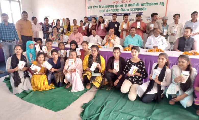 औरैया फफूंद श्री राम कुमार भारतीय महाविद्यालय में शनिवार को 566 छात्र-छात्राओं को स्मार्ट फोन वितरित किये गए। भाजपा जिलाध्यक्ष भुवन प्रकाश गुप्ता ने छात्र-छात्राओं को स्मार्ट फोन वितरण कर उन्होंने कहा कि वर्तमान समय में मोबाइल, स्मार्ट फोन आदि के बिना शिक्षा पूर्ण नहीं हो सकती। बशर्ते इसका प्रयोग सकारात्मक होना चाहिए। मोबाइल का प्रयोग विभिन्न प्रतियोगी परीक्षाओं की तैयारी के लिए किया जाए तो इसके सकारात्मक परिणाम मिल सकते हैं। कहा कि छात्र-छात्राओं को शिक्षा में अच्छे से तैयारी करने में मोबाइल बहुत ही उपयोगी साबित होगा। उन्होंने कहा कि इसी उद्देश्य को सामने रखकर सरकार से इस योजना को चलाया जा है। इस मौके पर आरएसएस के जिला प्रचारक अनूप जी, भाजपा जिला उपाध्यक्ष प्रेम कुमार गुप्ता, दिबियापुर नगर पंचायत अध्यक्ष राघव मिश्रा, महाविधालय के प्रबंधक मुकेश भारतीय, सुधा भारतीय, सृजल भारतीय मौजूद रहे।
