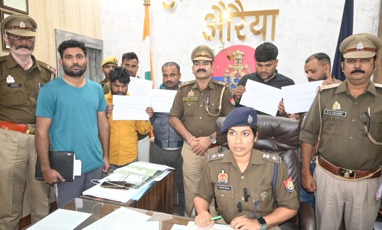 उत्तर प्रदेश औरैया पुलिस अधीक्षक चारू निगम के कुशल निर्देशन में व अपर पुलिस अधीक्षक दिगम्बर कुशवाहा के निकट पर्यवेक्षण में अपराध एवं अपराधियों के विरूद्ध चलाये जा रहे अभियान के क्रम में व क्षेत्राधिकारी सदर के नेतृत्व में घटना के अनावरण के लिए टीमें गठित की गयी। पुलिस अधीक्षक चारू निगम ने प्रेसवार्ता के दौरान घटना का खुलासा करते हुए बताया कि गठित टीमों द्वारा संयुक्त रूप से कार्यवाही करते हुए गस्त/चेकिंग के दौरान मुखबिर की सूचना पर योजनाबद्ध तरीके से आवश्यक घेराबंदी करते हुए 05 अभियुक्तगण योगीराज पुत्र विश्राम सिंह निवासी ग्राम उम्मेदपुर थाना सहायल जनपद औरैया। जयवीर सिह पुत्र रमेश चन्द्र निवासी कुरपुरा थाना बिधूना, विक्की उर्फ सतेन्द्र पुत्र प्रेमचन्द्र निवासी शास्त्रीनगर बाबरपुर थाना अजीतमल, आलोक कुमार पुत्र प्रेमचन्द्र निवासी ग्राम निवादा धाँधू थाना सहार व प्रवीण पाल पुत्र वेदप्रकाश पाल निवासी ग्राम चौकी मुस्तफाबाद थाना कोतवाली कन्नौज जनपद कन्नौज अभियुक्तगण के कब्जे से 4 लाख 70 हजार रुपए व घटना में प्रयुक्त एक अदद आई 10 कार यूपी 74 वी 4218 के साथ 08 दिसंबर 2023 समय करीब 21.05 बजे दिबियापुर रोड कांशीराम कॉलोनी कखावतू के पास से गिरफ्तार किया गया। बरामदगी के आधार अन्य धारा की बढ़ोतरी की गई। तथा अभि0 योगीराज के कब्जे से 01 अदद तमंचा 315 बोर व 01 अदद जिन्दा कारतूस 315 बोर बरामद किया गया। जिसके सम्बन्ध में थाना कोतवाली औरैया पर मुकदमा आयुध अधिनियम पंजीकृत किया गया है। अभियुक्तों को माननीय न्यायालय के समक्ष पेश किया जा रहा है। पूछताछ के दौरान आरोपी ने अपना जुर्म इकबाल किया है। गिरफ्तार करने वाली टीम में प्रथम टीम-एसओजी प्रभारी प्रवीन कुमार मय टीम व द्वितीय टीम में थाना प्रभारी कोतवाली औरैया श्री पंकज मिश्रा मय टीम रहे। विगत 30 अगस्त 2023 को वादी सतेन्द्र राव पुत्र रामकुमार निवासी बड़ागाँव भिविखी थाना डेरापुर जनपद कानपुर देहात द्वारा तहरीर दी कि 29 अगस्त 2023 को साईं मन्दिर के पास कुछ व्यक्तियों ने पैसे डबल करने की बात कह कर 01 लाख 40 हजार रुपए लिये और उनके बदले कागज व पन्नी में टेप से लिपटा हुआ वंडल दे दिया। प्रकरण के सम्बन्ध में थाना कोतवाली औरैया पर चोरी एवं धोखाधड़ी के तहत मुकदमा बनाम अज्ञात व दिनांक 08 दिसंबर 2023 को वादी जितेन्द्र पुत्र वासुदेव निवासी बिलावा थाना अजीतमल जनपद औरैया द्वारा तहरीर दी कि भाऊपुर ओवर व्रिज के पास कुछ अज्ञात व्यक्तियों द्वारा पैसे डबल करने की बात कह कर 05 लाख रुपए लिये और बदले में बन्द लिफाफा देकर चले गये। लिफाफा खोलकर देखा तो कागज के टुकड़े निकले। जिसके सम्बन्ध में थाना कोतवाली औरैया पर बनाम अज्ञात पंजीकृत किया गया।