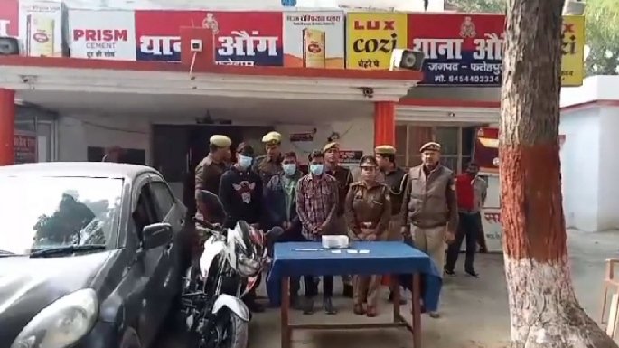 उत्तर प्रदेश जनपद फतेहपुर औंगथाना पुलिस को मिली एक बड़ी सफलताऔंग थाना क्षेत्र के छिवली नदी nh2 पर एक शख्स को लिफ्ट देकर लूट करने वाले कार सवार तीन लुटेरों को पुलिस ने किया गिरफ्तार एक आरोपी मौके से हुआ फरार बताते हैं कि एडिशनल एसपी फतेहपुर विजय शंकर मिश्रा द्वारा बताया गया कि 7, 8, 2023 कोऔंग थाना क्षेत्र के आशापुर के निकट एक व्यक्ति को कार से लिफ्ट देने के बहाने बैठाकर उससे ₹15000 नगद मोबाइल छीनकर मोबाइल से पासवर्ड पूछ कर फोन पे के जरिए 48500 लुटेरे ने अपनी पत्नी के खाते में डाल दिया तो वही औंग थाना पुलिस ने पीड़ित की शिकायत पर तत्परता पूर्वक कार सवार तीन लुटेरों को पकड़ लिया जबकि एक आरोपी मौके से फरार हो गया है जिसकी पुलिस तलाश में जुटी हुई है वही तलाशी के दौरान आरोपियों के पास से लूट के 9700 नगद दो तमंचा जिंदा कारतूस एक चाकू होंडा इमेजकार एक अपाचे बाइक बरामद हुई है वही अभियुक्त शैलेंद्र कुमार उर्फ शैलू उर्फ कार्तिक उर्फ शिवम पुत्र राकेश कुमार सोनकर निवासी अमौली थाना चांदपुर जनपद फतेहपुर रोहित कुमार उर्फ मारुति पुत्र स्वरूप प्रजापति निवासी शाह थाना गाजीपुर जनपद फतेहपुर तथा रंजीत कुमार पुत्र दिनेश कुमार कश्यप निवासी अमौली थाना चांदपुर जनपद फतेहपुर 24 वर्ष को पुलिस ने गिरफ्तार कर लिया है जबकिएक आरोपी पवन कुमार सोनी पुत्र शिव प्रसाद सोनी निवासी अमौली थाना चांदपुर जनपद फतेहपुर मौके से फरार हो गया है पुलिस तलाश में जुटी हुई है पकड़े गए आरोपियों के खिलाफ पुलिस ने मुकदमा पंजीकृत कर माननीय न्यायालय को रवाना किया है।