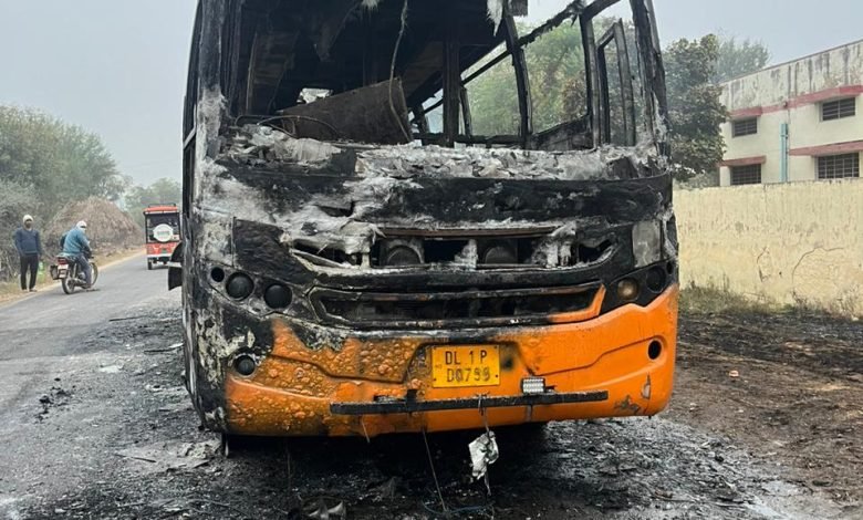 अलवर थाना रैणी क्षेत्र सवारियों से भर में सार्ट सर्किट से लगी आग बाल -बाल बची सभी सवारियां बस जलकर हुई राख। ( अनिल गुप्ता की खास रिपोर्ट )
