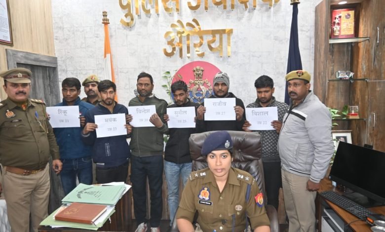 उत्तर प्रदेश औरैया पुलिस अधीक्षक औरैया श्रीमती चारु निगम के कुशल निर्देशन में व अपर पुलिस अधीक्षक औरैया श्री दिगम्बर कुशवाहा के निकट पर्यवेक्षण में अपराध एवं अपराधियों के विरुद्ध चलाये जा रहे अभियान के क्रम व क्षेत्राधिकारी बिधूना श्री अशोक कुमार के नेतृत्व में घटना के अनावरण हेतु गठित टीमों द्वारा कार्यवाही करते हुए गस्त/चेकिंग के दौरान मुखबिर की सूचना पर योजनाबद्ध तरीके से आवश्यक घेराबंदी कर अभियुक्तगण 1.सुनील पुत्र कौशल किशोर निवासी ग्राम जरियापुर थाना सौरिख जनपद कन्नौज 2.राजीव कुमार पुत्र ध्यान सिंह निवासी ग्राम सूरजपुर थाना ऐरवाकटरा जनपद औरैया 3.विन्देश उर्फ नरेन्द्र पुत्र नेम सिंह लोधी निवासी ग्राम तेहरा थाना वृन्दावन जनपद मथुरा 4.रिंकू पुत्र राम प्रकाश राजपूत निवासी ग्राम पहारपुरा थाना सिविल लाइन जनपद इटावा 5.विशाल पुत्र स्व0 सियाराम कमल निवासी ऐरवाकटरा थाना ऐरवाकटरा जनपद औरैया 6.मयंक पाल उर्फ मृदुल पाल पुत्र रामऔतार निवासी ग्राम किशन पुर थाना ऐरवाकटरा जनपद औरैया को दिनांक 08.01.2024 को समय करीब 02:25 बजे मन्नाकोला पुल ऐरवाकटरा के पास से गिरफ्तार किया गया। अभियुक्तगण उपरोक्त के कब्जे से 01 अदद ट्रैक्टर UP 79 U 8568 व घटना में प्रयुक्त कार नं0 UP 32 GW 4907 तथा अभियुक्तगण 1.सुनील पुत्र कौशल किशोर 2.राजीव कुमार पुत्र ध्यान सिंह 3.विन्देश उर्फ नरेन्द्र पुत्र नेम सिंह के कब्जे से 03 अदद नाजायज तमंचा 315 बोर व 03 अदद जिन्दा कारतूस 315 बोर बरामद किया गया । नाजायज असलहे के सम्बन्ध में थाना ऐरवाकटरा पर मु0अ0सं0 06/24 धारा 3/25 आर्म्स एक्ट बनाम सुनील,मु0अ0सं0 07/24 धारा 3/25 आर्म्स एक्ट बनाम राजीव कुमार, मु0अ0सं0 08/24 धारा 3/25 आर्म्स एक्ट बनाम विन्देश उर्फ नरेन्द्र पंजीकृत किया गया । बरामदगी के आधार पर मु0अ0सं0 292/23 में धारा 411/420 भादवि0 की बढोत्तरी की गयी है । गिरफ्तार अभियुक्त को माननीय न्यायालय के समक्ष पेश किया जा रहा है ।विगत दिनांक 30.12.2023 को वादी योगेश यादव पुत्र रामनरेश यादव निवासी हरिचन्दापुर थाना ऐरवाकटरा जनपद औरैया ने तहरीर दी कि मेरा आयशर ट्रैक्टर नं0 UP79U8568 मेरे घर से रात्रि में चोरी हो गया है जिसके सम्बन्ध में थाना ऐरवाकटरा में मु0अ0सं0 292/23 धारा 379 भादवि0 बनाम अज्ञात पंजीकृत किया गया । घटना के शीघ्र अनावरण हेतु पुलिस अधीक्षक औरैया श्रीमती चारू निगम द्वारा टीमों का गठन कर आवश्यक दिशा-निर्देश निर्गत किये।