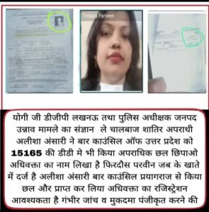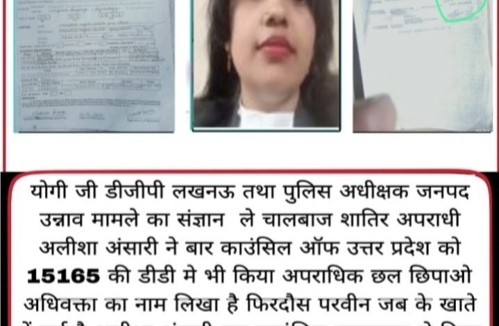 आज उत्तर प्रदेश में योगी आदित्यनाथ जी की सरकार है योगी जी के बड़े-बड़े आदेश जारी है कि उत्तर प्रदेश में हमारे होते हुए भ्रष्टाचार अत्याचार फर्जी वड़ा तथा भूमाफियाओं का राज्य नहीं चलेगा अगर सच्चाई की बात करें तो यह सब वादे जमीनी स्तर पर सिमटे दिखाए पड़ रहे है जनपद उन्नाव के शुक्लागंज में अलीशा अंसारी तथा मां मुन्नी बेगम का एक बड़ा गैंग सक्रिय है इन मां बेटियों का कार्य फर्जी डॉक्यूमेंट के जरिए बड़े-बड़े आपराधिक कार्य को अंजाम देना है और कई जनपदों में अपराधिक काम को अंजाम दिया जा चुका है इन गैंग का मुख्य उपदेश है मेलो तथा सोने की दुकानों में घात लगाकर चोरी करना क्षेत्र की सीधी शादी महिलाएं तथा बेटियों को पैसों का लालच देकर गलत कार्य करवाना तथा निर्दोष लोगों द्वारा स्तनो को नोचना हाथ पकड़ना गर्भ को गिराना जैसे आरोप लगाकर 354 376 के झूठे मुकदमे में फंसा कर धन की मोटी उगाई करती आ रही है तथा बात ना मानने पर जेल भेजती आ रही है उन्नाव बार के पूर्व अध्यक्ष जाने माने अधिवक्ता ने एक ऐसी रचना रची विगत,3 वर्षों तथा पूर्व के किए गए अपराधिक कार्य को छुपाने के लिए मां मुन्नी बेगम को कहेकसा परवीन आलीशा अंसारी को फिरदौस परवीन का नाम दे दिया अलीशा अंसारी जिस फिरदौस परवीन की डिग्री का इस्तमाल कर रही है ????जिसका विवरण इस प्रकार से है ????सन 2007 में हाई स्कूल किया था???? जिसका रोल नंबर1086681 है जिसमें अलीशा अंसारी की बहन फिरदौस परवीन का फोटो चस्पा है ????सन 2012 में इंटर किया???? जिसका रोल नंबर,4089697 है जिसमें फोटो किसी और महिला की चस्पा है तथा ????सन 2814 में बीए दितीय किया ????जिसका रोल नंबर,1180661है जिसमें फोटो किसी अन्य महिला की चस्पा है जो इन चारों महिला से मैच नहीं खाती है ????सन 2016 के एल एलबी के एग्जाम में नाम फिरदौस परवीन का एडमिशन के फार्म में अलीशा अंसारी की फोटो चस्पा अन्य महिलाओं को एग्जाम में बैठाकर परीक्षा पास की तथा उत्तर प्रदेश बार काउंसिल प्रयागराज से????सन 2020 में,रजिस्ट्रेशन,UP02898/20 में????फिरदौस परवीन महिला के नाम का फर्जी लाइसेंस प्राप्त कर लिया अपने को बता रही है फिरदौस परवीन उर्फ अलीशा अंसारी एडवोकेट किए गए अपराधी तथ्य पर शातिर मां बेटी पर्दा डाल कर उत्तर प्रदेश पुलिस प्रशासन को तथा बार काउंसिल ऑफ इंडिया उत्तर प्रदेश को गुमराह कर रही है फिरदौस परवीन नाम का फर्जी लाइसेंस का लाभ लेकर न्यायधीश महोदय के समक्ष काला कोट पहन कर न्यायधीश महोदय को गुमराह तथा कानून को धोखा दे रही है सबसे बड़ी बात सामने ये नजर आ रही है ????सन 2020 के sbi शुक्लागंज जनपद उन्नाव से अलीशा अंसारी ने ????अपने खाते तथा अकाउंट से (15165) का डिमांड ड्राफ्ट???? बार काउंसिल प्रयागराज को भेजा गया ????फर्जी अधिवक्ता का लाभ लेकर उत्तर प्रदेश बार काउंसिल प्रयागराज तथा ????उत्तर प्रदेश 
