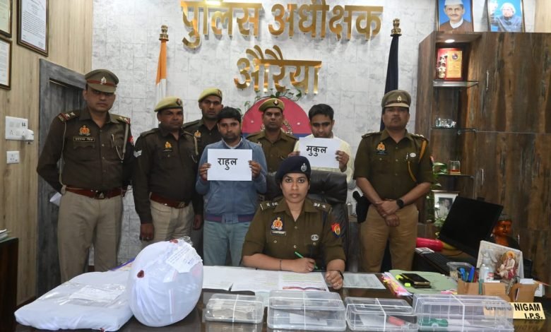 उत्तर प्रदेशऔरैया अपर पुलिस महानिदेशक कानपुर जोन, कानपुर एवं पुलिस उपमहानिरीक्षक कानपुर परिक्षेत्र, कानपुर के निर्देशन व पुलिस अधीक्षक औरैया श्रीमती चारू निगम के पर्यवेक्षण में अजीतमल पुलिस द्वारा की गयी कार्यवाही। विगत दिनाँक-19.02.2024 को अटसू में बिल्डिंग मैटेरियल की दुकान की गुल्लक से टप्पेबाजी कर चोरी किये गये 60,000/- रुपयों के सम्बन्ध में थाना अजीतमल पर मु0अ0सं0 71/2024 धारा 380 भादंवि बनाम अज्ञात पंजीकृत हुआ था जिसके उपरान्त श्रीमान पुलिस अधीक्षक औरैया चारू निगम द्वारा अपराध एवं अपराधियों के विरूद्ध चलाये जा रहे अभियान के क्रम में श्रीमान अपर पुलिस अधीक्षक औरैया श्री दिगम्बर कुशवाहा के निर्देशन में श्रीमान क्षेत्राधिकारी अजीतमल श्री राम मोहन शर्मा के कुशल पर्यवेक्षण में राजकुमार सिंह प्रभारी निरीक्षक कोतवाली थाना अजीतमल के कुशल नेतृत्व में गठित टीम द्वारा आज दिनांक 28.02.2024 को गश्त/चेकिंग के दौरान मुखबिर खास की सूचना पर उक्त अभियोग से संबंधित अभियुक्तगण 1. राहुल सिंह 2. मुकुल सिंह को जालौन की तरफ जाने वाले मार्ग पर एकलव्य पार्क के पास जैनपुर बम्बा के पास से सिखाये गये तरीके से घेराबन्दी व दबिश देकर गिरफ्तार किया गया अभियुक्तगण उपरोक्त के कब्जे से दो अदद नाजायज तमंचा मय चार अदद जिन्दा कारतूस व मु0अ0सं0-71/2024 धारा-380 भादवि की घटना में प्रयुक्त एक अदद मोटर साइकिल TVS अपाचे बिना नम्बर प्लेट व एक अदद हेलमेट व अभियुक्तगण की निशा देही पर मु0अ0सं0 71/2024 से सम्बन्धित टप्पेबाज कर चोरी किये गये 60,000/- रुपये, एक अदद पिट्ठू बैग व एक अदद पेचकश बरामद किया गया। उपरोक्त बरामदगी के आधार पर थाना अजीतमल,औरैया पर क्रमशः मु0अ0सं0 87/2024 धारा 3/25 आर्म्स एक्ट बनाम राहुल सिंह उपरोक्त व मु0अ0सं0 88/2024 धारा 3/25 आर्म्स एक्ट बनाम मुकुल सिंह उपरोक्त के विरुद्ध पंजीकृत कर अग्रिम विधिक कार्यवाही की जा रही है। घटना स्थल- जालौन की तरफ जाने वाले मार्ग पर एकलव्य पार्क के पास जैनपुर बम्बा के पास थाना अजीतमल