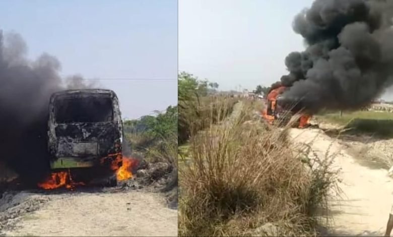 गाजीपुर।उत्तर प्रदेश के गाजीपुर जिले मरदह थाना क्षेत्र के बरही में बस में लगी आग में बड़ा हादसा हुआ है। यहां एक यात्री बस में 11 हजार वोल्ट के हाईटेंशन तार छू जाने से बस में आग लग गई।आग लगते ही बस धू-धू कर जलने लगी।मौके पर चीख-पुकार मैच गई।अभी तक 5 लोगों की मौत हो चुकी है।मृतकों की संख्या बढ़ने की संभावना है।