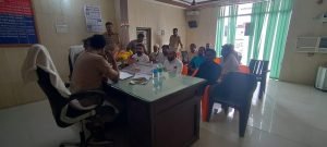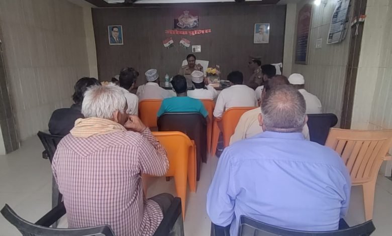औरैया पुलिस अधीक्षक औरैया श्रीमती चारू निगम के निर्देशानुसार जनपद के समस्त थानों में आगामी त्यौहारों, अलविदा जुम्मा व ईद-उल-फितर के दृष्टिगत सभी धर्मों के धर्म गुरूओं के साथ व सभी ग्राम प्रधानों सहित अन्य सम्भ्रान्त लोगों को थाना हाज़ा पर बुलाकर समस्त क्षेत्राधिकारियों एवं थाना प्रभारियों द्वारा पीस कमेटी की बैठक की गई जिसमे शान्ति-सौहार्द एवं चाक चौबन्द सुरक्षा व्यवस्था का भरोसा देते हुए आपसी भाई चारे के साथ शान्तिपूर्ण ढंग से आगामी त्यौहारों को मनाने की तथा पुलिस सहयोग की अपील की गई ।
