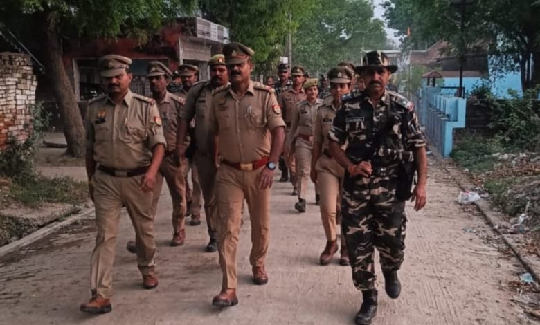 ( थाना करारी क्षेत्र में आगामी लोकसभा चुनाव में सुरक्षा व्यवस्था के दृष्टिगत पैरामिलिट्री फोर्स व भारी पुलिस दल-बल के साथ किया गया फ्लैग मार्च )