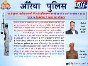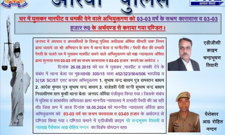 उत्तर प्रदेश जनपद औरैया में अपराध व अपराधियों के विरुद्ध पुलिस अधीक्षक औरैया श्रीमती चारु निगम द्वारा चलाये जा रहे अभियान के क्रम में थाना बेला व मानीटरिंग / पैरवी सैल की प्रभावी पैरवी के चलते घर में घुसकर मारपीट करने वाले अभियुक्तगण को मा0 न्यायालय औरैया द्वारा सुनाया गया 03-03 वर्ष का सश्रम कारावास व 03-03 हजार रूपये का अर्थदंड । दिनांक 26.08.2015 को घर में घुसकर , मारपीट व धमकी देने के संबंध में थाना बेला पर मु0अ0सं0 305/15 धारा 452/323/504/506 भादवि0 व 3(1)X SC/ST एक्ट बनाम अभियुक्तगण 1. सुभाष चन्द्र बाथम पुत्र रामरतन बाथम 2. आदेश कुमार पुत्र सुभाष चन्द्र बाथम 3. राजेश्वरी देवी पत्नी सुभाष चन्द्र बाथम निवासीगण ग्राम कुर्सी थाना बेला जनपद औरैया पंजीकृत किया गया । जिसके संबंध में पुलिस व शासकीय अधिवक्ता द्वारा माननीय न्यायालय मे प्रभावी पैरवी की जा रही थी। जिस क्रम में आज दिनांक 18.05.2024 को माननीय न्यायालय औरैया द्वारा अभियुक्तगण को 03-03 वर्ष का सश्रम कारावास व 03-03 हजार के अर्थदण्ड से दण्डित किया गया । दण्डित कराने में एडीजीसी क्राइम श्री चन्द्रभूषण तिवारी व न्याया0 पैरोकार आ0 रोहित नन्दन का विशेष योगदान रहा।