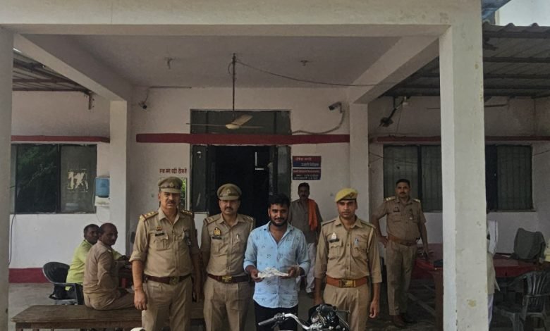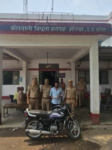 उत्तर प्रदेश औरैया पुलिस अधीक्षक श्रीमती चारू निगम के कुशल निर्देशन में अपराध एवं अपराधियों के विरूद्ध चलाये जा रहे अभियान के क्रम में व क्षेत्राधिकारी बिधूना श्री अशोक कुमार के निकट पर्यवेक्षण में व थाना प्रभारी बिधूना श्री बृजेन्द्र सिंह के नेतृत्व में थाना बिधूना पुलिस टीम ने दिनांक 25.06.2024 पसुआ पुल के पास से समय करीब 23.00 बजे गस्त/चेकिंग के दौरान मुखबिर की सूचना पर अभियुक्त 1. राजीव पुत्र ध्यान सिंह उम्र करीब 27 वर्ष नि0 सूरजपुर एरवा थाना एरवाकटरा जनपद औरैया को गिरफ्तार कर माननीय न्यायालय भेजा गया ।अभियुक्त के कब्जे से 01 अदद चोरी की मोटरसाइकिल व 01 अदद नाजायज तमंचा 315 बोर व 01 अदद जिन्दा कारतूस 315 बोर बरामद किया गया। । बरामद मोटर साइकिल के आधार पर थाना बिधूना पर पंजीकृत मु0अ0सं0 237/24 धारा 379 भादवि0 में धारा 411 की बढोत्तरी की गयी तथा बरामद नाजायज तमंचे के सम्बन्ध में थाना बिधूना पर मु0अ0सं0 244/24 धारा 3/25 आर्म्स एक्ट बनाम राजीव पंजीकृत कर अभियुक्तको माननीय न्यायालय के समक्ष पेश किया गया।दिनांक 24.06.2024 को वादी शिव चन्द्र कुमार पुत्र किशनलाल निवासी पुर्वा मके थाना बिधूना ने अपनी मोटर साइकिल चोरी होने के सम्बन्ध में थाना बिधूना पर अज्ञात चोर के सम्बन्ध में लिखित तहरीर दी तहरीर के आधार पर मु0अ0सं0 237/24 धारा 379 भादवि0 बनाम अज्ञात पंजीकृत किया गया।