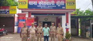 उत्तर प्रदेश जनपद प्रयागराज: पुलिस कमिश्नर के निर्देशन मे थानाध्यक्ष उपेंद्र प्रताप सिंह टीम को मिली सफलता थाना झूंसी पुलिस ने प्रदेश स्तरीय चिन्हित भू- माफिया हिस्ट्रीशीटर गणेश यादव को गिरफ्तार किया है। भूमाफिया गणेश यादव का लंबा अपराधिक इतिहास रहा है।पुलिस आयुक्त प्रयागराज के निर्देशन में अपराध एवं अपराधियों के विरुद्ध चलाये जा रहे अभियान के क्रम में पुलिस उपायुक्त नगर व सहायक पुलिस आयुक्त झूंसी के कुशल पर्यवेक्षण में व थानाध्यक्ष उपेन्द्र प्रताप सिंह के कुशल नेतृत्व में उ0नि0 कपिल कुमार मय पुलिस टीम के थाना स्थानीय के मु0अ0सं0- 517/2023 धारा147/148/149/307/386/323/504/506/397/34 भादसं व 7 CLA ACT. से सम्बन्धित वांछित अभियुक्त प्रदेश स्तरीय चिन्हित भू-माफिया व थाना स्थानीय का हिस्ट्रीशीटर गणेश यादव पुत्र स्व0 लाल जी यादव निवासी हवेलिया थाना झूंसी जनपद प्रयागराज को नियमानुसार दिनांक 06.07.2024 को समय 15.12 बजे मल्लू की चाय के दुकान बहद ग्राम हवेलिया झूंसी से गिरफ्तार किया गया । आवश्यक विधिक कार्यवाही की जा रही हैं।