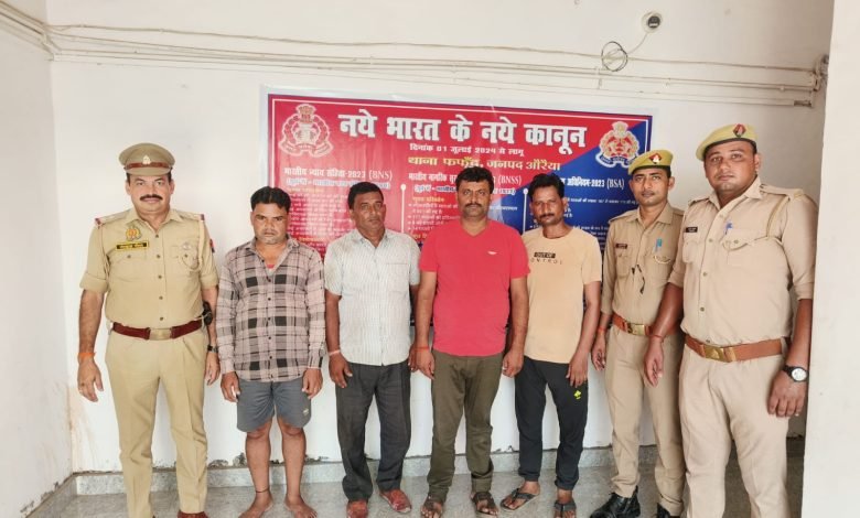 उत्तर प्रदेश औरैया पुलिस अधीक्षक महोदय के निर्देशन में श्रीमान क्षेत्राधिकारी महोदय के पर्यवेक्षण में थानाध्यक्ष के नेतृत्व में थाना फफूंद पुलिस टीम द्वारा वारण्टी/वांछित अभियुक्तगण के विरूद्ध लगातार चलाये जा रहे अभियान के क्रम में दिनांक 16/07/24 को थाना फफूंद पुलिस टीम द्वारा चेकिंग के दौरान मुखबिर की सूचना पर अभियुक्तगण 1.शिवाकान्त पुत्र सतीश चन्द्र नि0 ग्राम भरसेन थाना कोतवाली औरेया जनपद औरेया उम्र 36 वर्ष आदि 04 नफऱ अभियुक्तगण को मुरादगंज तिराहे से मुरादगंज कि तरफ गदनपुर रोड पर करीब 200 मीटर थाना फफूद से गिरफ्तार किया गया । जिनके कब्जे से 52 अदद तास पत्ता व माल फङ- निल एवं 14500/- रू0 जामा तलाशी से बरामद हुये ,तथा मौके से 1. सत्यदेव पुत्र अज्ञात नि0 सल्हूपुर थाना फफूंद जनपद औरेया 2. पप्पू पुत्र अज्ञात नि0 सल्हूपुर थाना फफूंद जनपद औरेया भागने में सफल रहे जिनकी गिरफ्तारी हेतु टीम गठित कर दी गयी है जल्द गिरफ्तार किये जायेगे। पकड़े गये व्यक्तियों का यह कृत्य धारा 13 जी एक्ट के तहत दण्डनीय अपराध है उक्त के सम्बन्ध में थाना हाजा पर मु0अ0सं0 232/24 धारा 13 जी एक्ट में पंजीकृत किया गया ।