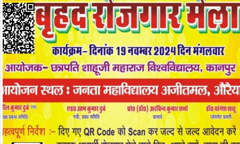 औरया अजीतमल जनता महाविद्यालय में 18/35 वर्षीय युवाओं/युवतियों के लिए 19 नवंबर को आयोजित होगा रोजगार मेला मेले में नौकरी पाने का सुनहरा अवसर वेवसाईट पर आनलाइन निशुल्क पंजीकृत करें । ( पंकज सिंह राणावत की खास रिपोर्ट )